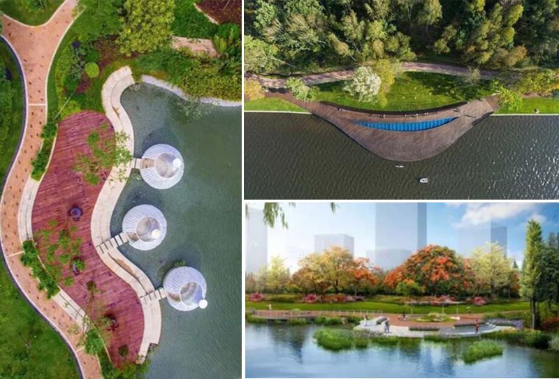 依托現狀地形地貌,打造親水平臺,結合用地規劃打造條狀小游園。