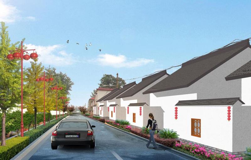 3、路面設施方面,建議將現有水泥路面改造成高承載力、高透水性、易維護且景觀效果好的彩色透水混凝土路面。道路兩側設置路燈加入燈籠元素。