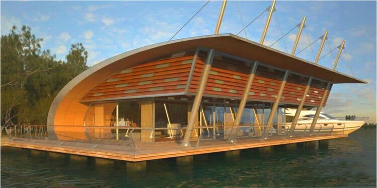 產品描述:水上建筑設計適宜采用通透的建筑外殼,輕盈的建筑造型,因此該水上運動中心建筑設計采用現代風格,采用鋼架結構的形式,建筑材料專用采用鋼構架、防腐木和玻璃,屋頂設計采用流線型,挑出屋頂的柱子和鋼絲拉線與現狀水上高爾夫的張拉膜結構形成統一風格。